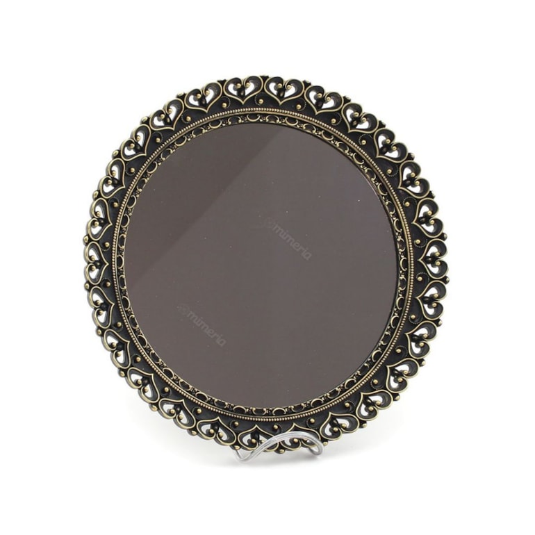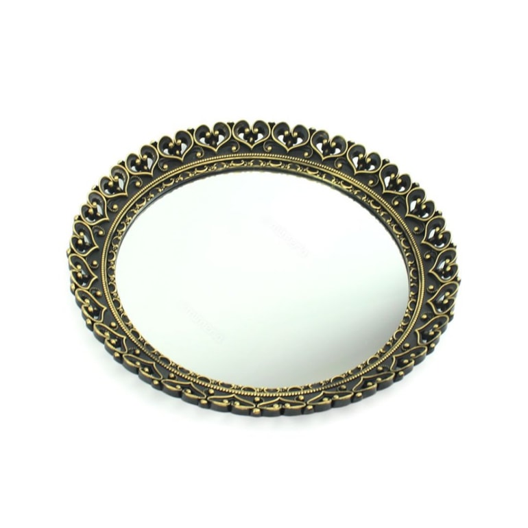 A Bandeja Oval com Espelho Coração Dourada tem estrutura plástica, formato oval, base espelhada e borda de coração. Um charme!