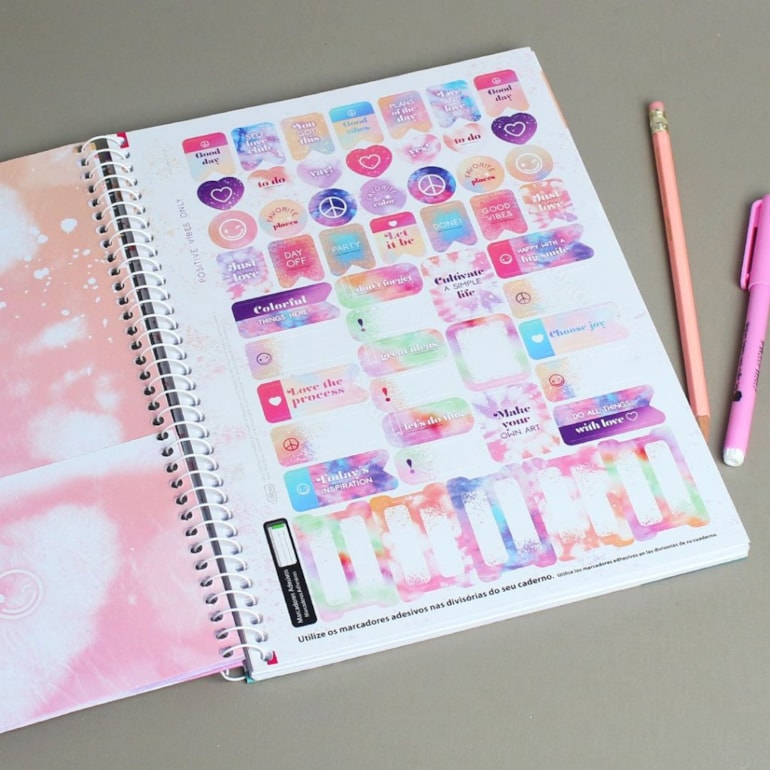 O Caderno Universitário Good Vibes Tie Dye Rosa 80 Folhas ainda conta com uma cartela super completa de adesivos, um envelope para armazenar seus principais papéis e uma folha inteira para você se organizar e preencher com todas as informações necessárias! Sua capa é dura e vem estampada com a frase “Let the good vibes roll” sobre um fundo de tie dye rosa, lilás e amarelo!