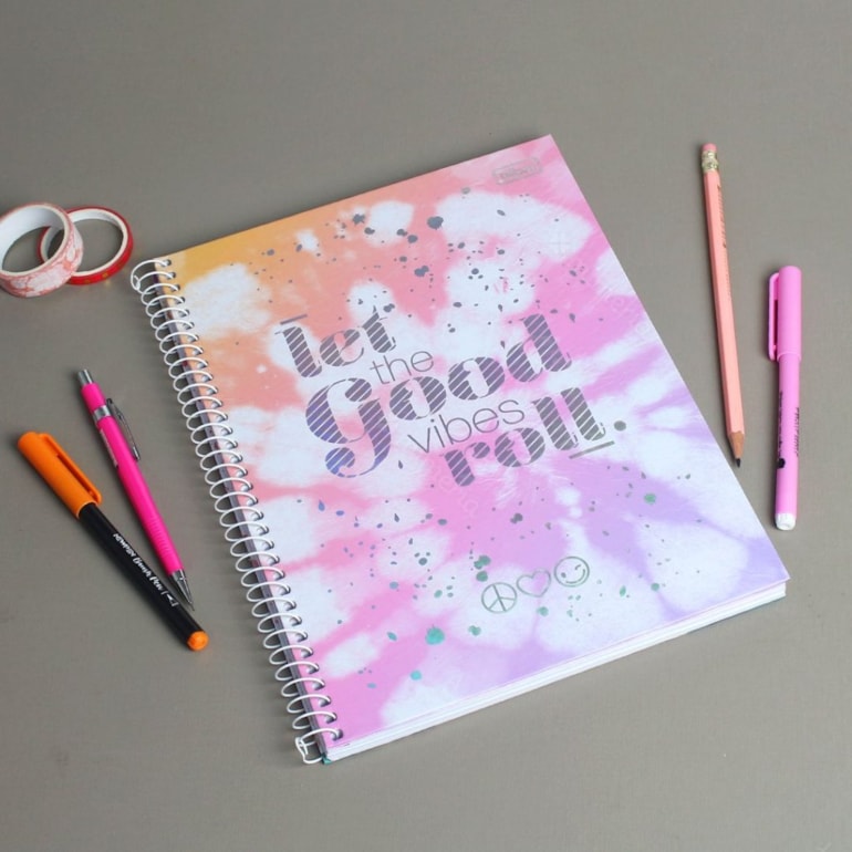 O Caderno Universitário Good Vibes Tie Dye Rosa 80 Folhas é o mimo mais delicado e alto astral que a sua papelaria poderia ter! Super bonito e versátil, ele é a escolha perfeita para você usar no trabalho, faculdade ou para os afazeres do dia a dia!