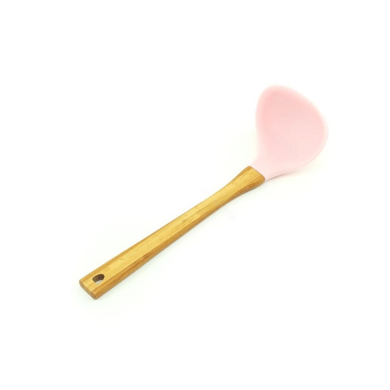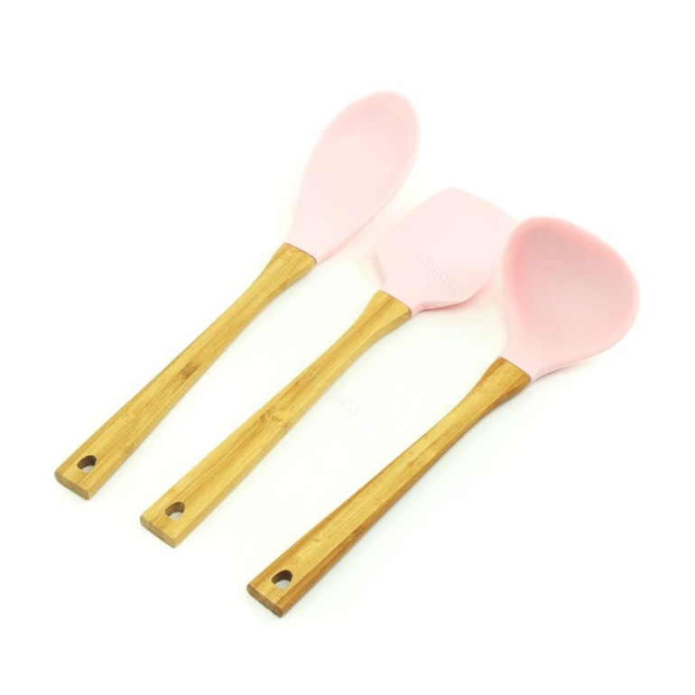 o Kit de Utensílios de Silicone com Cabo de Bambu Soft 3 Peças Rosa vem com uma concha, uma colher e uma espátula, o trio perfeito para arrasar na cozinha!