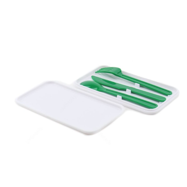 - Contém: 2 compartimentos, 1 divisória removível, 3 talheres (garfo, faca e colher);
