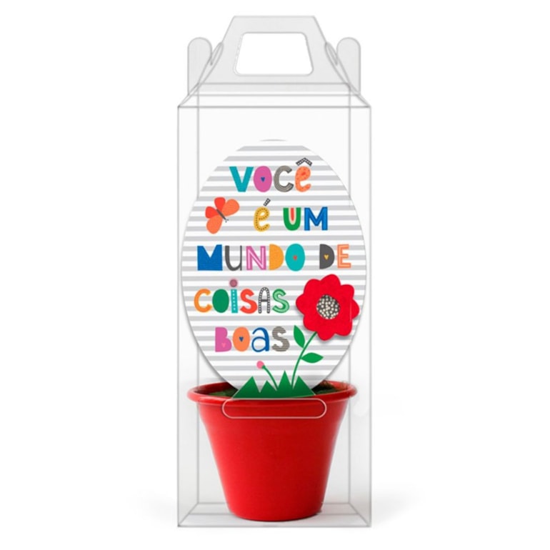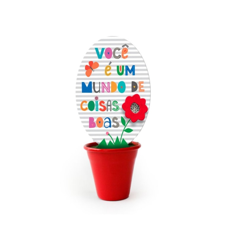 Produzido em materiais de alta qualidade, este vasinho vem com uma tag oval estampada com a frase: “Você é um mundo de coisas boas” em fundo branco com aplique de tecido em forma de florzinha.
