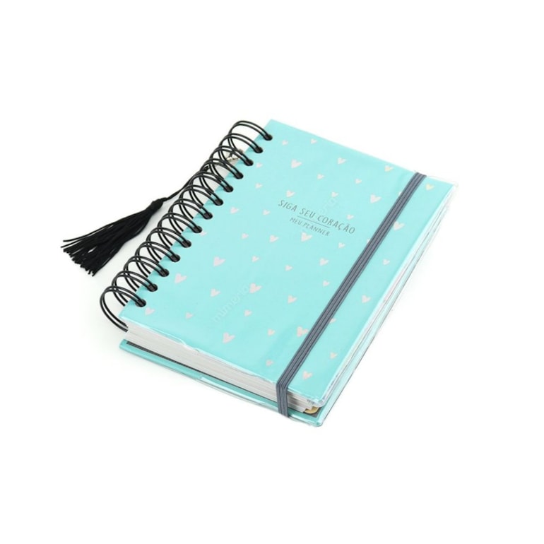 O Planner Permanente Corações Holográficos Pequeno tem a capa decorada com fundo verde com corações prata com uma frase inspiradora: "Siga seu coração", além de contar com um lindo pingente. Um mimo de planner para você combinar com calendário de mesa, cadernos e tudo mais do mesmo tema. Não é lindo?