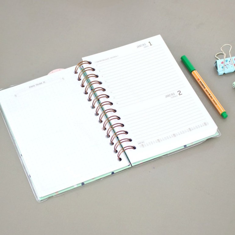 Prática, esta agenda tem acabamento em espiral, conta com fechamento em elástico e miolo completo com envelope plástico, cartela de adesivos e agenda diária. Tudo o que você poderia querer!