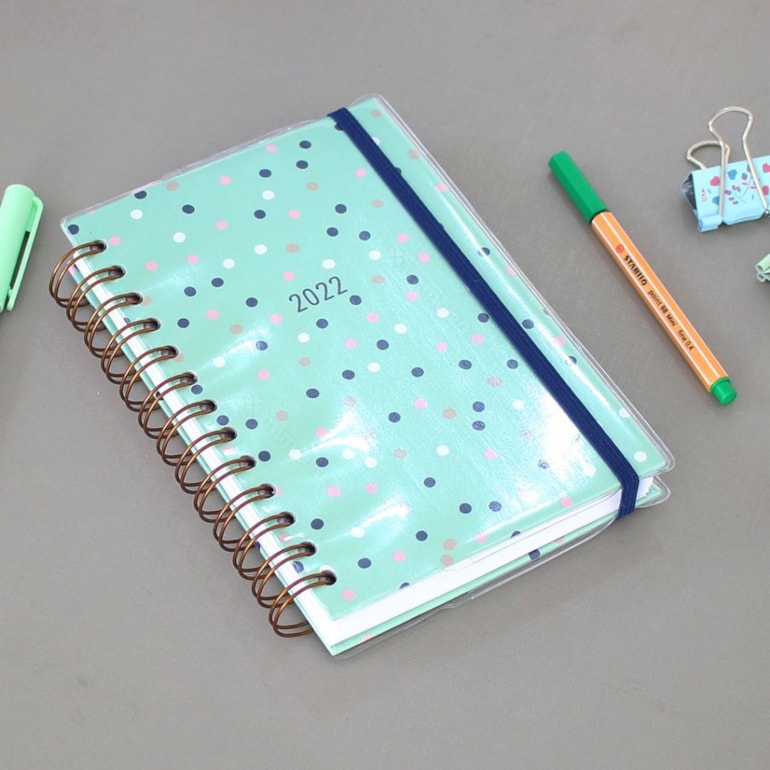 A Agenda 2022 Diária Poá Verde-Água Média tem linda capa com estampa poá em fundo verde-água. Um charme!