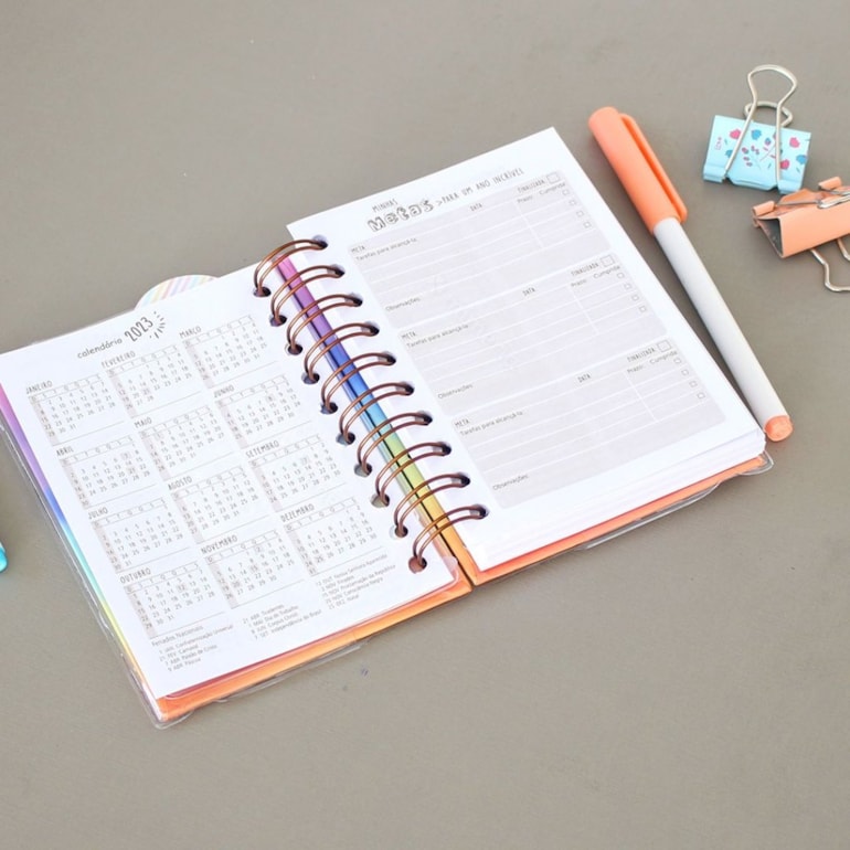 A Agenda 2022 Diária Tie Dye Pequena tem miolo completo com página para dados pessoais, calendário 2022 e 2023, metas e agenda diária. Super versátil!