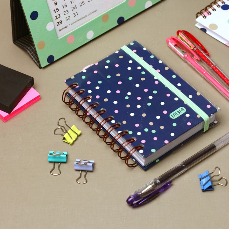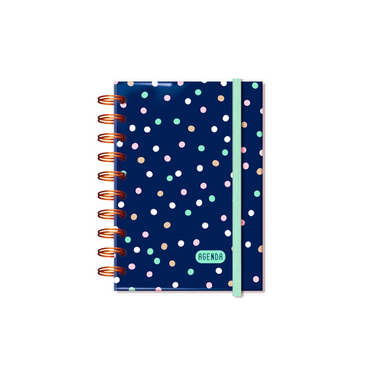 Super fofa, esta agenda tem estampa poá com bolinhas coloridas em fundo branco, conta com fechamento em elástico e acabamento em espiral. Perfeita para combinar com outros mimos de papelaria fina da mesma coleção.