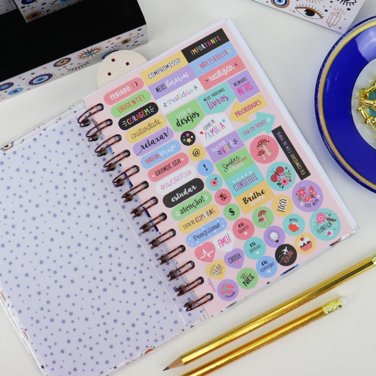 A Agenda 2024 Diária Olho Grego Azul Média é um produto exclusivo Mimeria e conta com 176 páginas com espaço de uma página para cada dia da semana (exceto sábado e domingo) para fazer anotações, marcar compromissos e lembretes e tudo mais o que quiser.