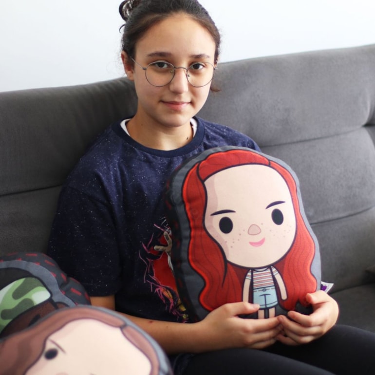 AAlmofada Stranger Things Max Fibra é super macia, fofinha e quentinha, ela vem com os detalhes e cores característicos da personagem Max e vai deixar a hora de maratonar Stranger Things ainda mais especial e intima, tudo o que você poderia querer!