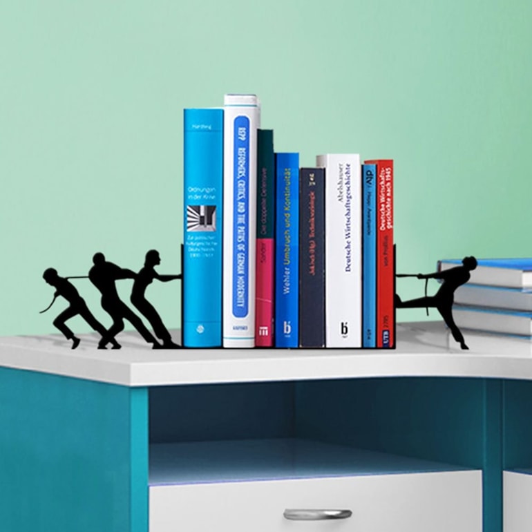 Produzido em aço, vem com um par de aparador com design diferenciado em forma de cabo de guerra. Muito divertido, é perfeito para aparar uma sequência grande de livros e deixar o espaço ainda mais alegre!