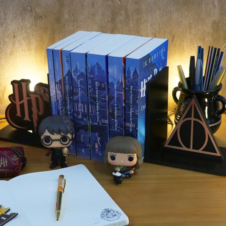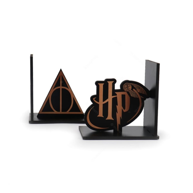 Lindíssimo, e com um acabamento perfeito, ele vem produzido em MDF e serve para separar os seus livros com praticidade e de maneira ultra organizada! Conta com duas partes em formato de “L”, sendo uma com o logo “HP” e pomo de ouro, e outra com o símbolo das relíquias da morte. Ambas com corte a laser 3D, e trabalhadas com riqueza de cores e detalhes!