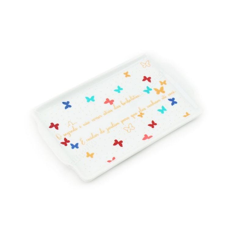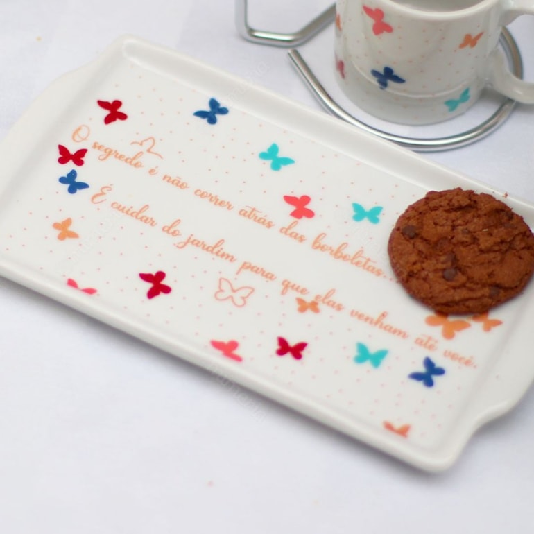 Super fofa, esta bandeja tem estampa de borboletas coloridas e a frase: “O segredo é não correr atrás das borboletas… É cuidar do jardim para que elas venham até você” em fundo branco. Que mimo! Ideal para decorar sua sala de estar, sala de jantar, cozinha, quarto, varanda gourmet e muito mais!