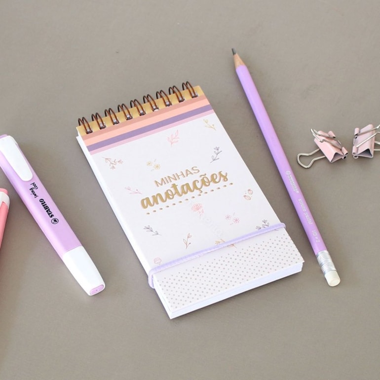 O Bloco Minhas Anotações Amanhecer vem todo estampado com ramos de flores ultra delicadinhos e listras coloridas super fofas, em sua capa vem a frase “minhas anotações” em dourado e ele é tudo o que faltava para deixar a sua papelaria completa!