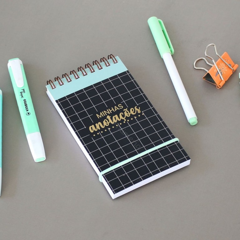 O Bloco Minhas Anotações Grid vem todo estampado em um quadriculado preto com branco e tendo seus detalhes em verde menta, ele também possui a frase “Minhas anotações” em dourado no centro de sua capa, é um mimo indispensável!