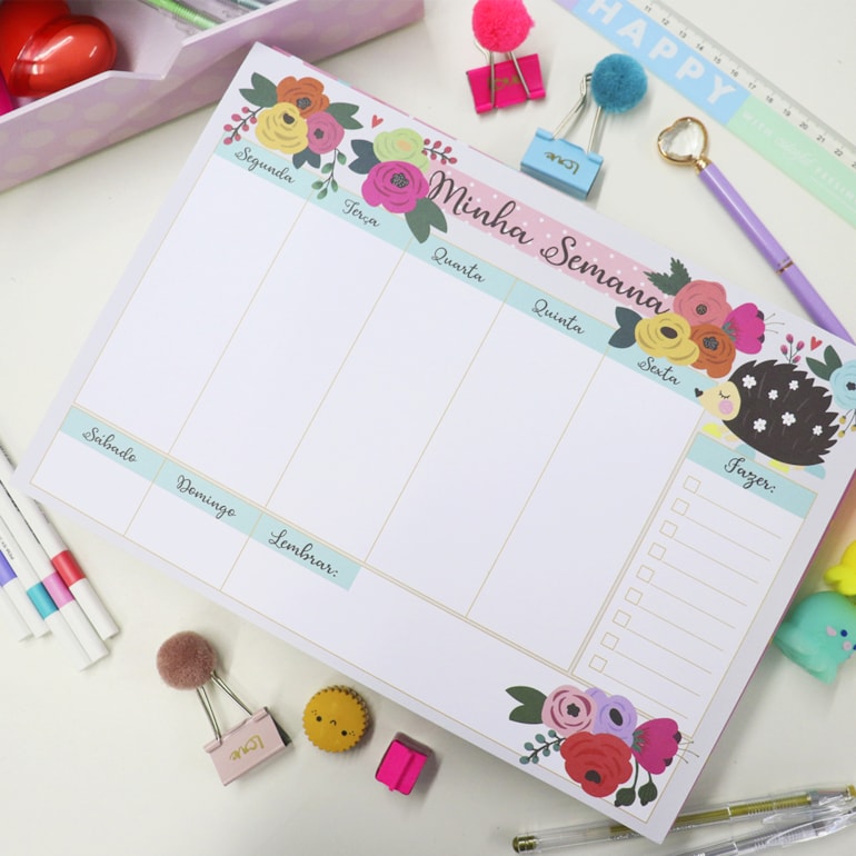 - Bloco Planner de Mesa Semanal Porco Espinho Floral;