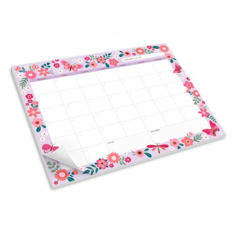 O Bloco Planner de Mesa Mensal Borboletas tem linda estampa de flores e borboletas em fundo lilás. Perfeito para combinar com outros mimos de papelaria da mesma coleção!