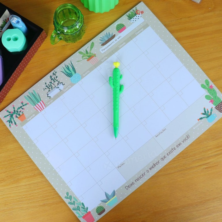 Exclusivo da Mimeria, o Bloco Planner Mensal Cactos Bege é ideal para planejar seu To-do com praticidade. Organize e registre os compromissos do trabalho, estudo ou pessoais de forma semanal. Vem com folhas que podem ser destacadas quando precisar e que podem ser penduradas em murais, geladeira e onde mais quiser, tendo seu planejamento sempre por perto e não deixando escapar nenhum compromisso.