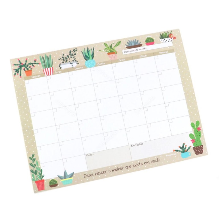 Com o Bloco Planner Mensal Cactos Bege você vai planejar mês a mês sua rotina. Uma ótima opção para presentear amigas, mãe, esposa e quem mais gosta e precisa dessa rotina organizada.
