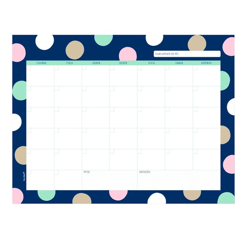 Bonito e muito usual, conta com 12 folhas decoradinhas com bolinhas de poá em tons de verde, rosa, branco e cinza, sobre um fundo azul escuro! Ele também conta com quadrantes mensais super espaçosos e um lugar próprio metas e anotações, é tudo o que você necessitava para o seu dia a dia!