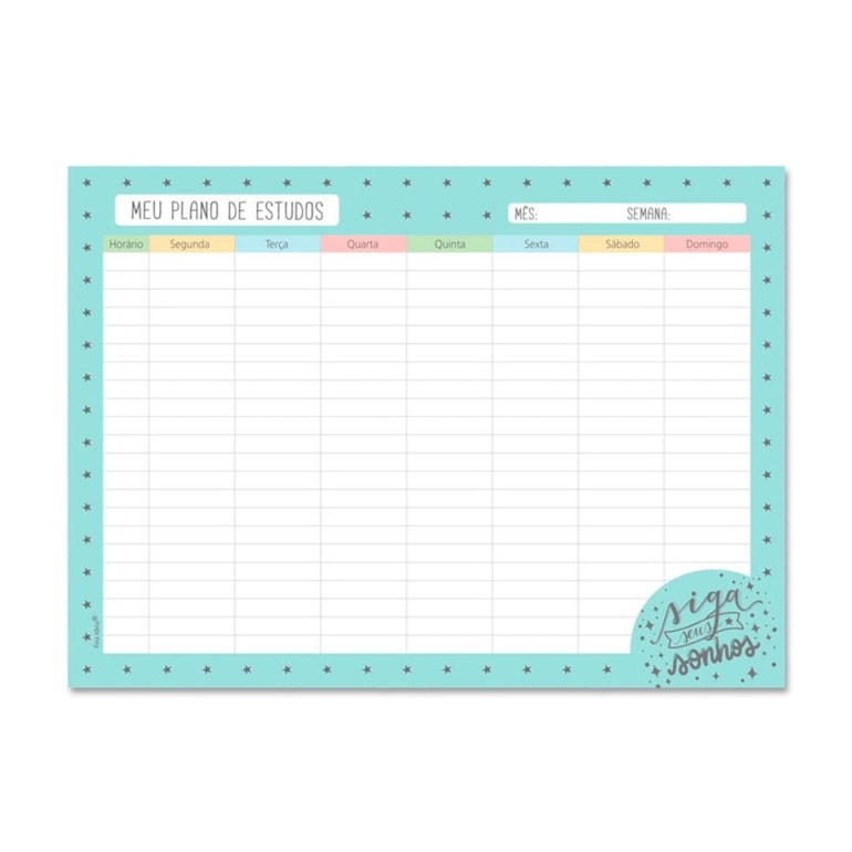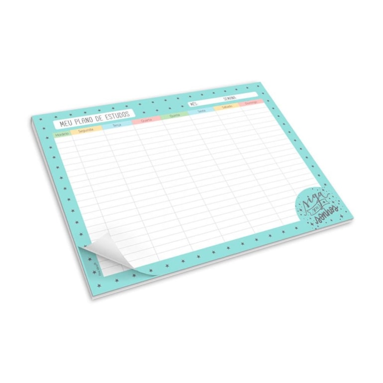 O Bloco Plano de Estudos Verde Estrelas além de super usual, tem estampa super fofa com a frase: “Siga seus sonhos” em fundo verde-água com estrelas. Tudo o que você poderia querer!