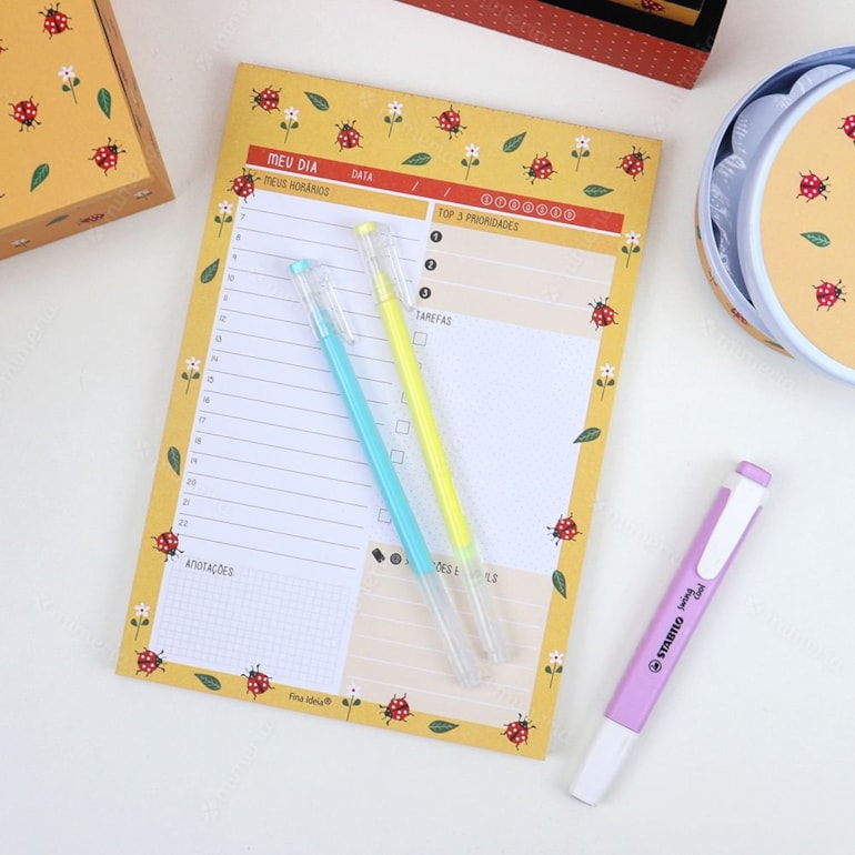 Com o Bloco Tarefas do Dia Joaninha, você consegue visualizar suas metas do dia a dia e fica mais próximo dos seus objetivos, além disso, ele proporciona praticidade e pode ser colocado dentro da sua bolsa e levado para todos os lugares.