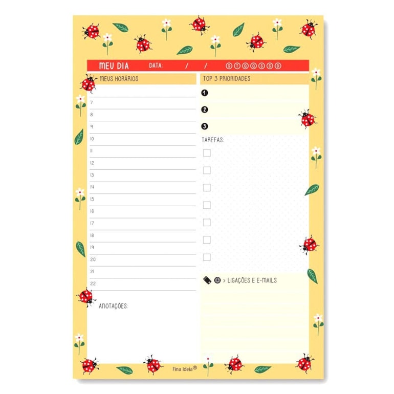 Ele conta com espaço para data, dia da semana, organização de horários, suas prioridades, tarefas, anotações importantes, ligações e e-mail a serem feitos. Apresenta um design delicado – as laterais têm um lindo tom de amarelo mostarda, joaninhas e flores estampadas. É uma verdadeira gracinha!