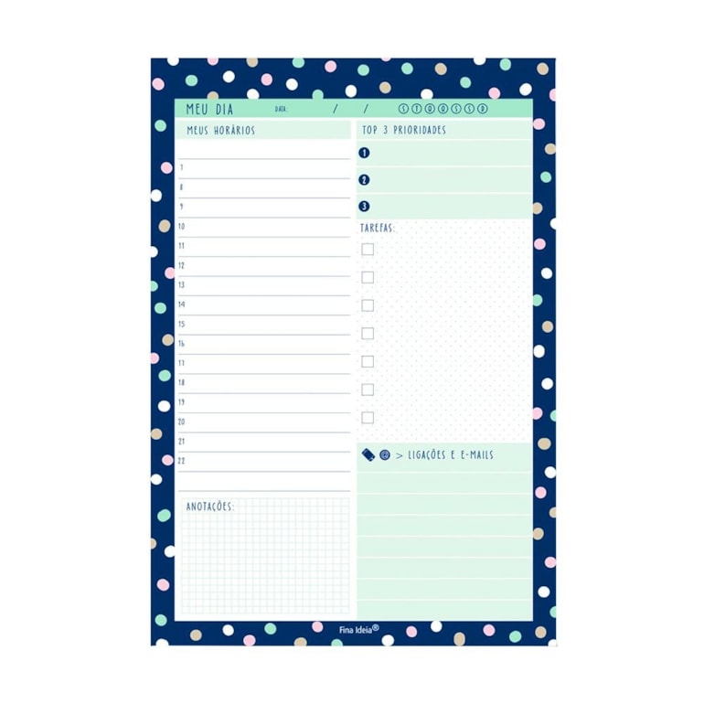 O Bloco Tarefas do Dia Poá vem estampado com um padrão super fofo de poá coloridinho sobre um fundo azul escuro, é o mimo perfeito para você!