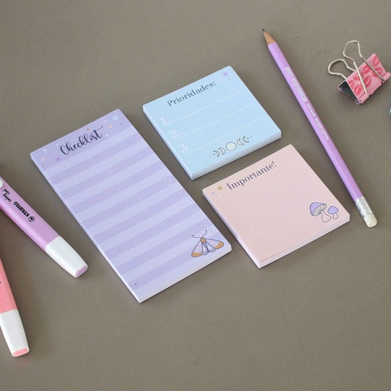 Lindíssimos, eles contam com 3 bloquinhos com 50 folhas não adesivas de papel offset cada! São perfeitos para serem deixados ao lado do seu notebook enquanto você faz aquele home office rotineiro!