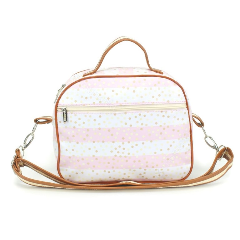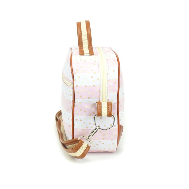 A Bolsa Maleta Utilitária Confete Rosa vem com uma estampa super fofa de listras rosas e brancas com confetes dourados e um belíssimo acabamento em marrom e tecido cru, é a combinação ideal para fazer parte dos seus dias!