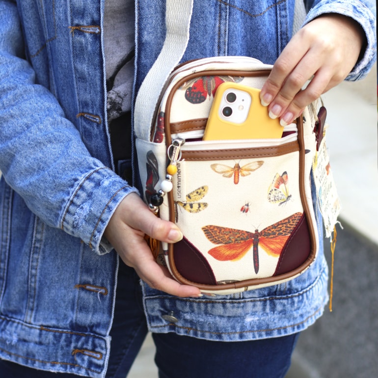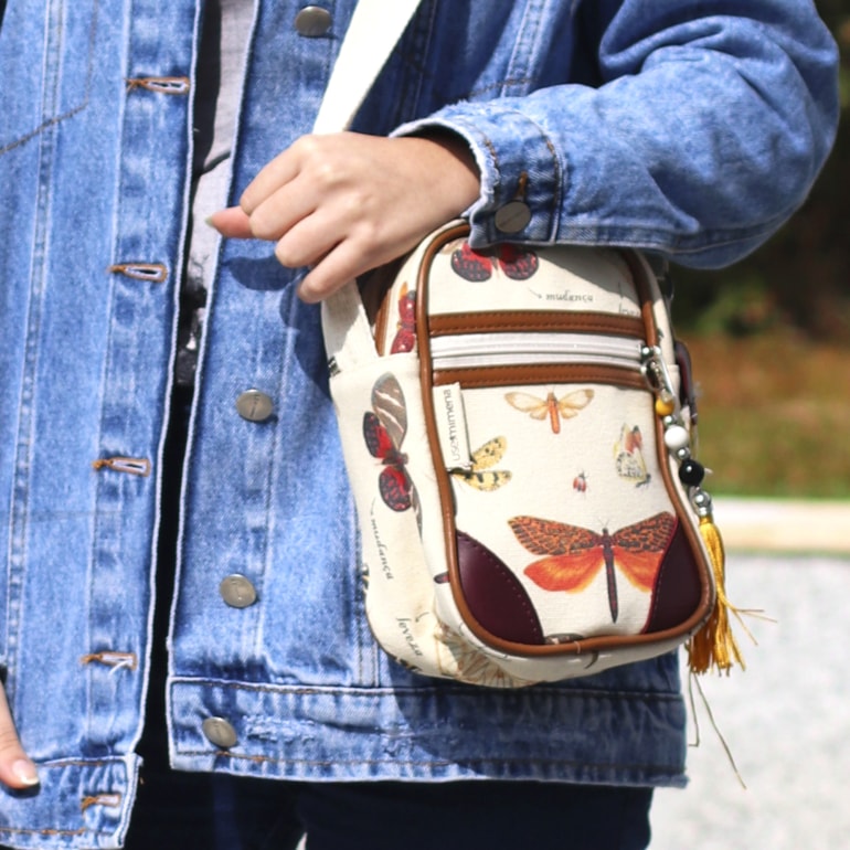 A Bolsa Shoulder Bag Borboleta vem com uma belíssima estampa de borboletas coloridas e cheias de significados sobre um fundo cru, um verdadeiro mimo!