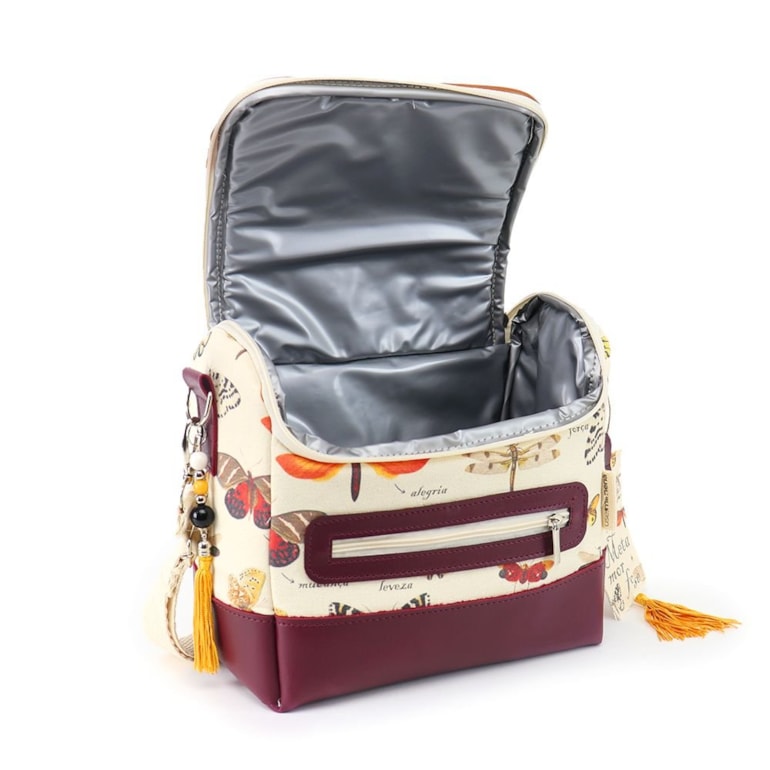 A Bolsa Térmica Baú Borboleta é mega espaçosa e conta com uma abertura tipo baú, ela também vem com um bolso lateral para guardar seus talheres e guardanapos! Tudo isso sobre uma encantadora estampa de borboletas coloridas e cheias de significado sobre um fundo cru, o verdadeiro mimo!