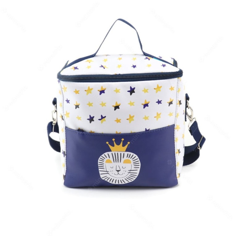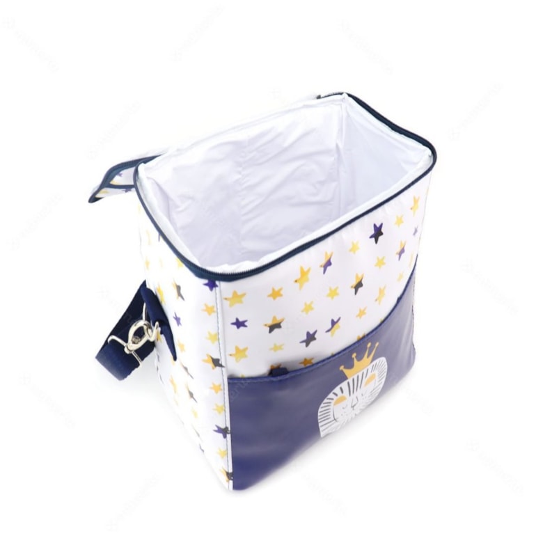 A Bolsa Térmica Leãozinho possui uma estampa encantadora trabalhada com estrelinhas douradas e azuis com um bolso belíssimo estampado com um fofo leãozinho ornamentado com uma coroa e um impecável acabamento azul, exatamente tudo o que você necessitava!