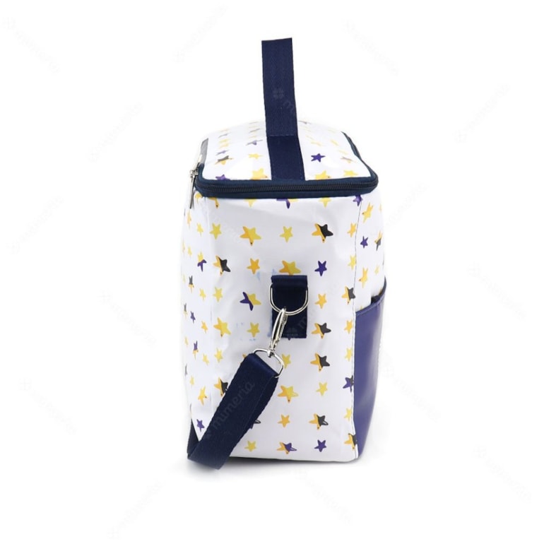 Meiga e super cômoda, possui tamanho médio e vem trabalhada em nylon, polietileno e PVC. Seu interior conta com um revestimento térmico espumado e ela possui seu fechamento através de um zíper duplo, além de contar com uma alça de mão e uma alça transversal regulável e removível e um prático bolso externo, é o mimo perfeito para você!