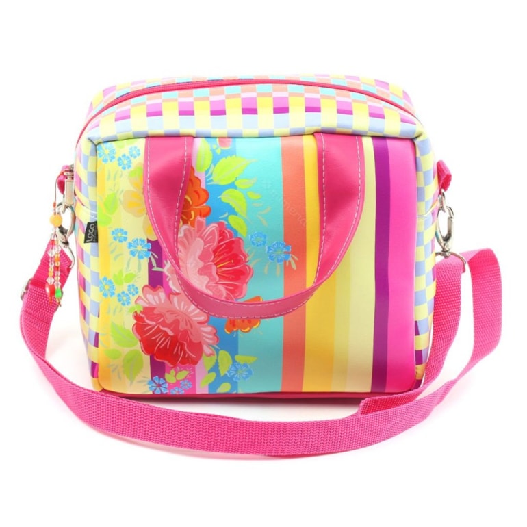 A Bolsa Térmica Média Bem Me Quero Listrada é super charmosa, ela vem com uma estampa toda coloridinha formada por listras, flores e quadradinhos com cores mescladas, além de vir com um penduricalho super delicado com pingente de frutinhas e miçangas, pendurado no seu zíper central. É o mimo que você precisava!