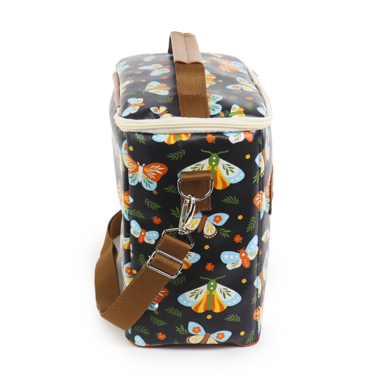 Confeccionada em tecido sintético, a Bolsa Térmica Move Grande Mariposa é estampada num fundo escuro com lindas mariposas e borboletas em tons de azul, laranja e verde, rodeadas por mini florzinhas.