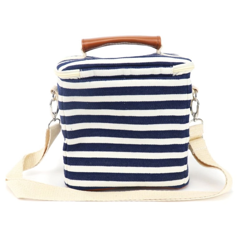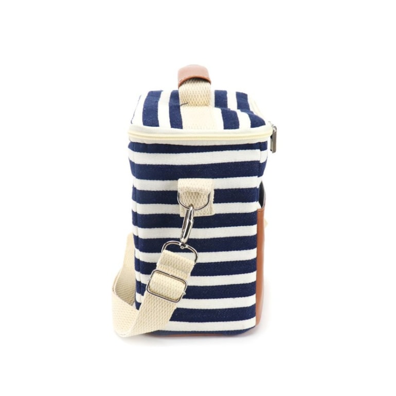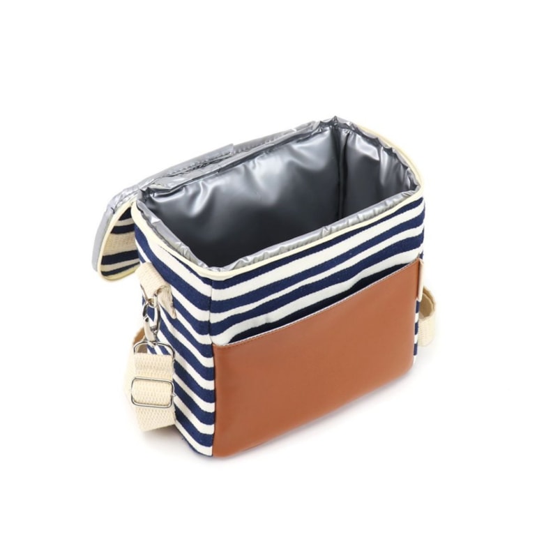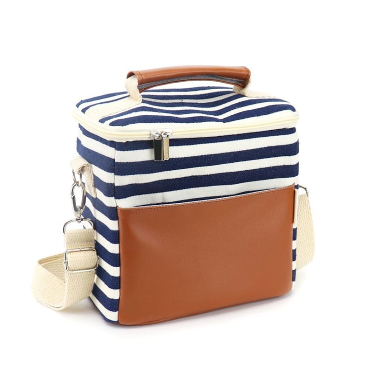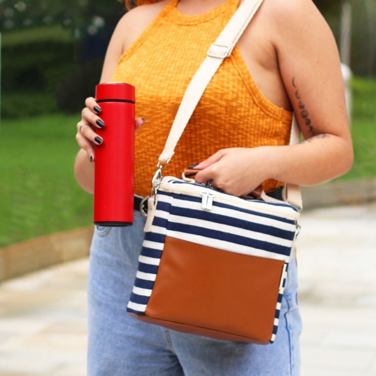 A Bolsa Térmica Move Listras Azul Marinho possui seu fechamento em zíper duplo e conta com um bolso frontal que é ideal para carregar talheres e guardanapos! Ela vem estampada com listras em um majestoso tom de azul marinho, contrastadas com listras em tecido cru, tudo isso acrescido de ricos detalhes em marrom! É o mimo mais do que perfeito para te acompanhar durantes todas as suas refeições fora de casa!