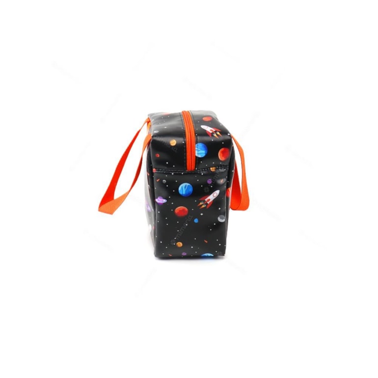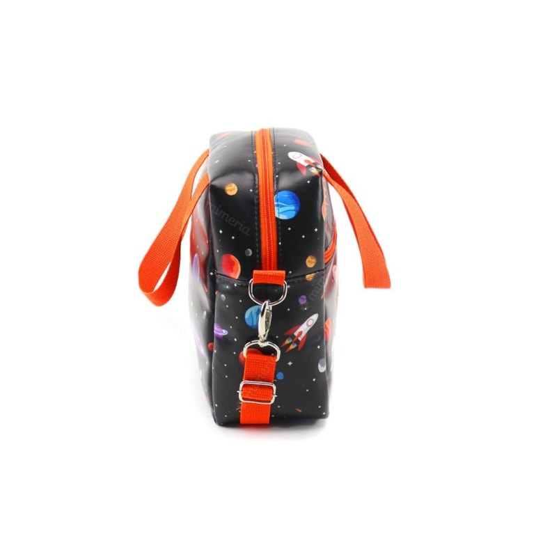Ela tem um design impecável: apresenta planetas, estrelas e foguetes estampados em fundo preto. Conta com uma alça de mão e outra que é transversal e removível, então, é tudo muito prático. É confeccionada com muito cuidado, com policloreto de vinila e algodão de alta qualidade.