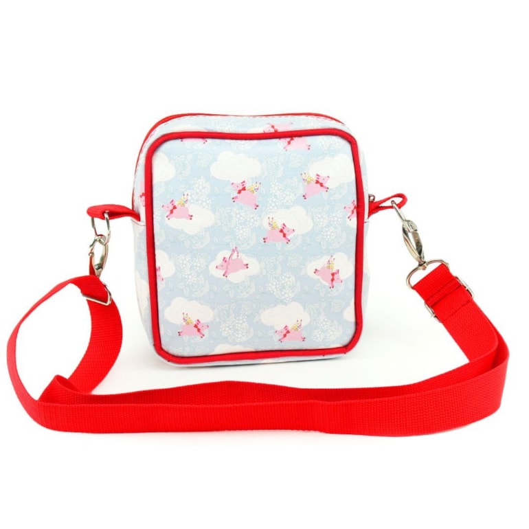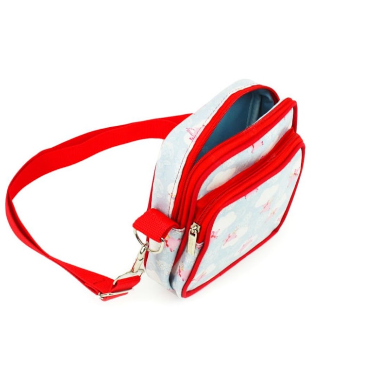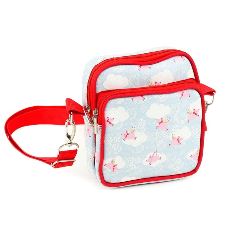 A Bolsa Transversal Shoulder Bag Porquinho Tudo é Possível tem linda estampa de porquinhos voadores nas cores rosa, azul e vermelho. Com tamanho super compacto e é ideal para carregar carteira, celular, necessaire e tudo o que precisa levar no dia a dia.