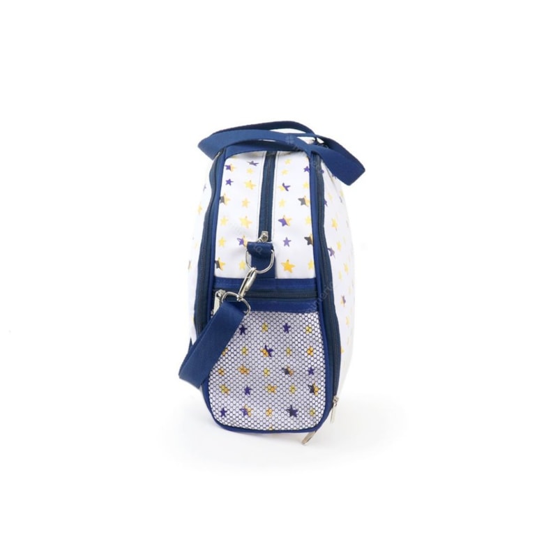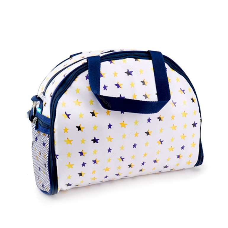 A Bolsa Trocador Leãozinho vem estampada com estrelinhas deslumbrantes na cor azul, e na cor dourada, tudo isso sobre um belo fundo branco, com detalhes e acabamentos em azul marinho, um luxo!