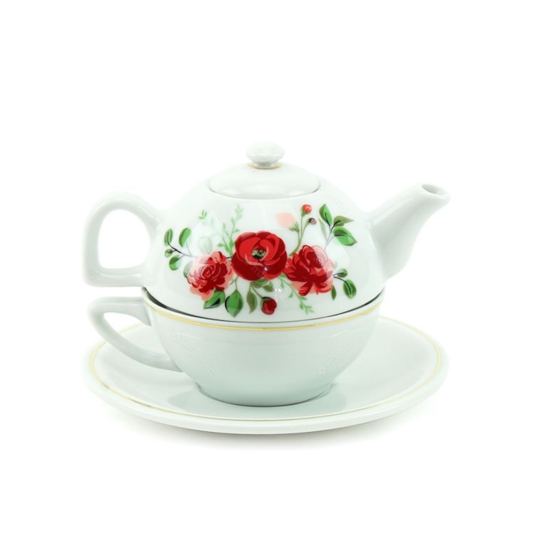O Bule com Xícara e Pires de Porcelana Romance Gold tem estampa lindinha de rosas vermelhas e detalhes em dourado. Perfeito para usar e decorar sua cozinha, varanda gourmet, copa, cantinho do café e muito mais.