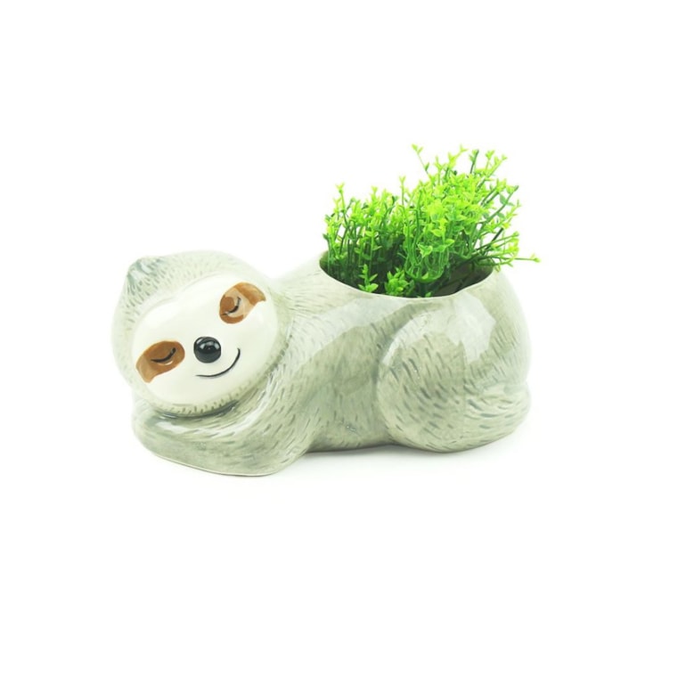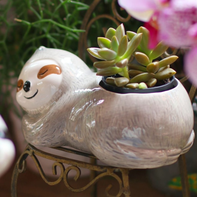 Produzido em porcelana, ele possui excelente qualidade , vem no formato de uma fofa preguicinha cinza deitada, e possui uma abertura redonda para colocar todas as suas plantinhas com comodidade!