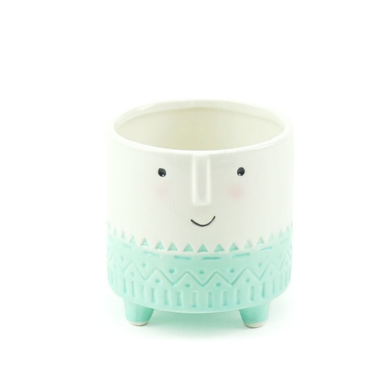 O Cachepô em Porcelana Menino Tribal Verde vem com um rosto desenhado e possui a parte debaixo da sua peça trabalhada em um tom de verde com uma estampa étnica traçada por meio de pontos e linhas, ele é absolutamente lindo!
