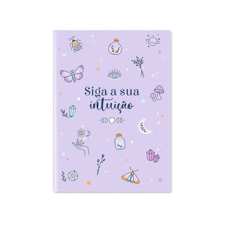 Com tamanho perfeito para ser colocada na sua bolsa e levada para qualquer lugar, ela tem fundo lilás e estampas que nos remetem ao mundo místico. Além disso, vem com uma frase encorajadora: “siga a sua intuição''.