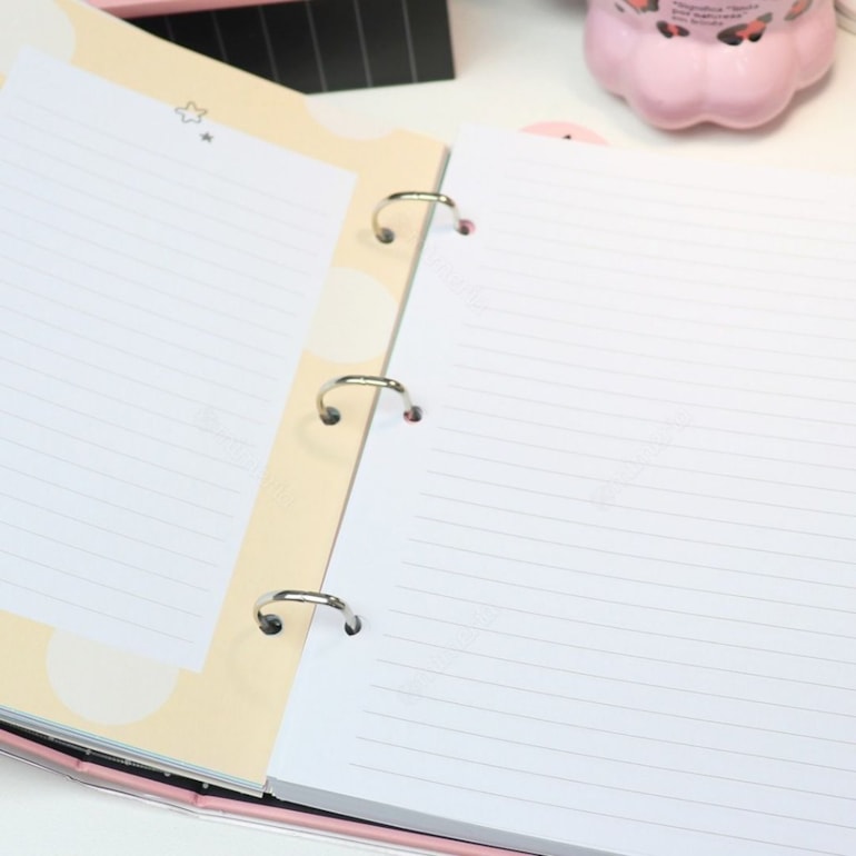 Em fundo rosinha e estampa com póas tem dois gatinhos, um preto e um branco. Um charme por fora e por dentro, este fichário tem capa dura e capa extra protetora em plástico cristal, conta com três argolas metálicas, vem com 160 folhas pautadas, um envelope plástico, uma régua decorada encaixável, uma cartela de adesivos e 12 divisórias estampadas e coloridas. Tudo o que você poderia querer!