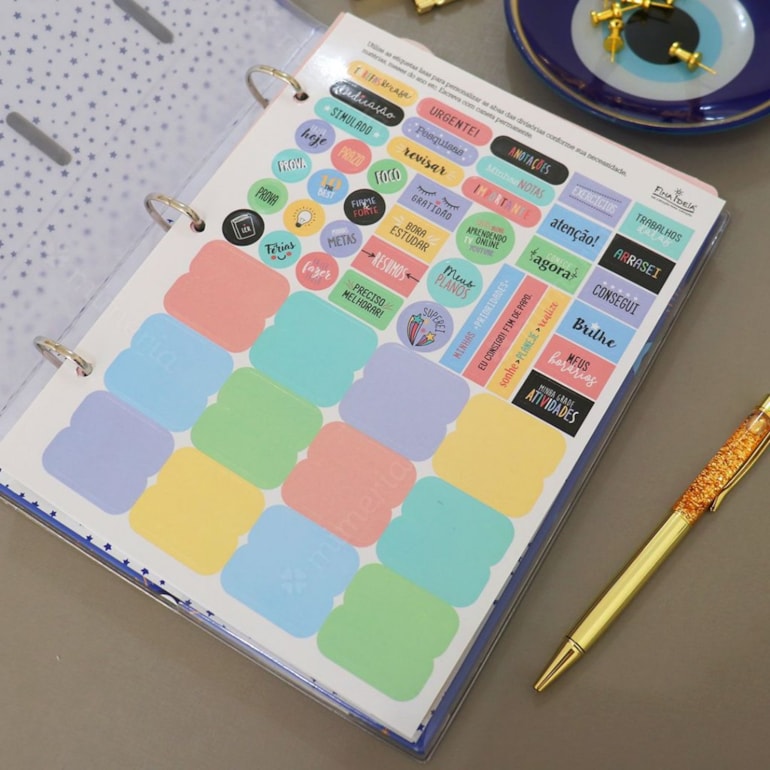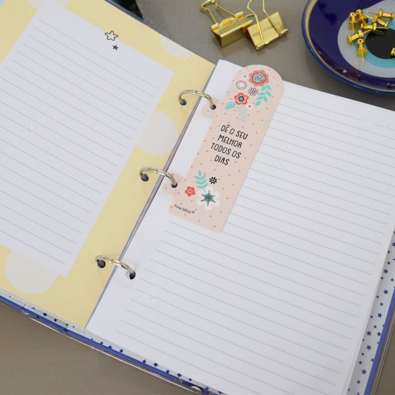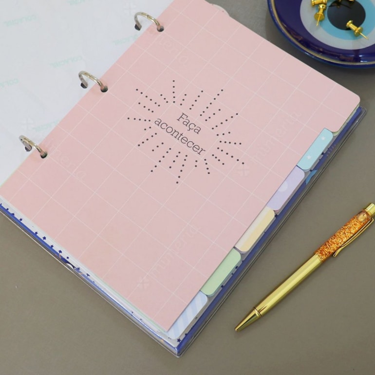 Super original, é um produto exclusivo Mimeria e conta ao todo com 12 divisórias coloridas com frases inspiradoras, 120 folhas, uma cartela de adesivos, um envelope de plástico, um marcador e ainda possui sua capa e contracapa revestida com plástico cristal! É um mimo completamente perfeito para levar boas energias para seus estudos ou trabalho!