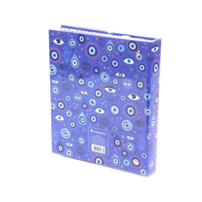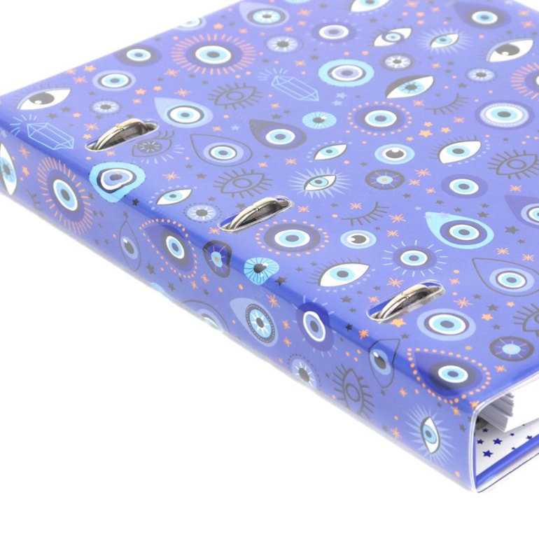 O Caderno Argolado Fichário Olho Grego é belíssimo! Ele vem todo estampado com vários tipos de olhos gregos com detalhes em dourado e preto sobre um fundo azul, é impossível não se apaixonar!