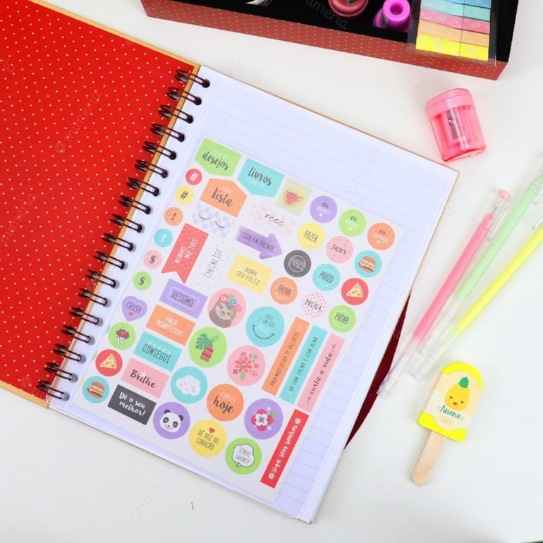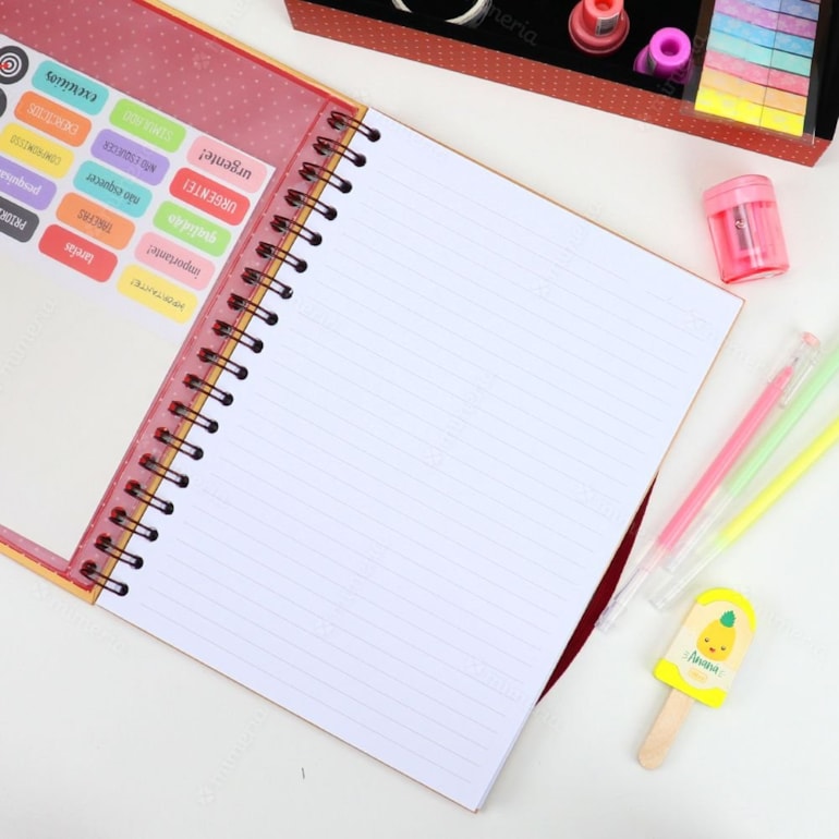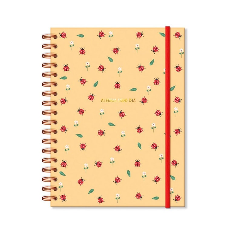 Ele conta com 80 folhas, fechamento em elástico, 1 cartela de adesivos e 1 envelope de plástico resistente, ideal para armazenar documentos, lembretes e outros itens. O caderno apresenta encadernação wire-o, o que proporciona maior nível de qualidade se comparado com métodos comuns e conta também com design delicado – capa dura, com fundo amarelo mostarda, joaninhas e delicadas flores estampadas. É uma gracinha, né?