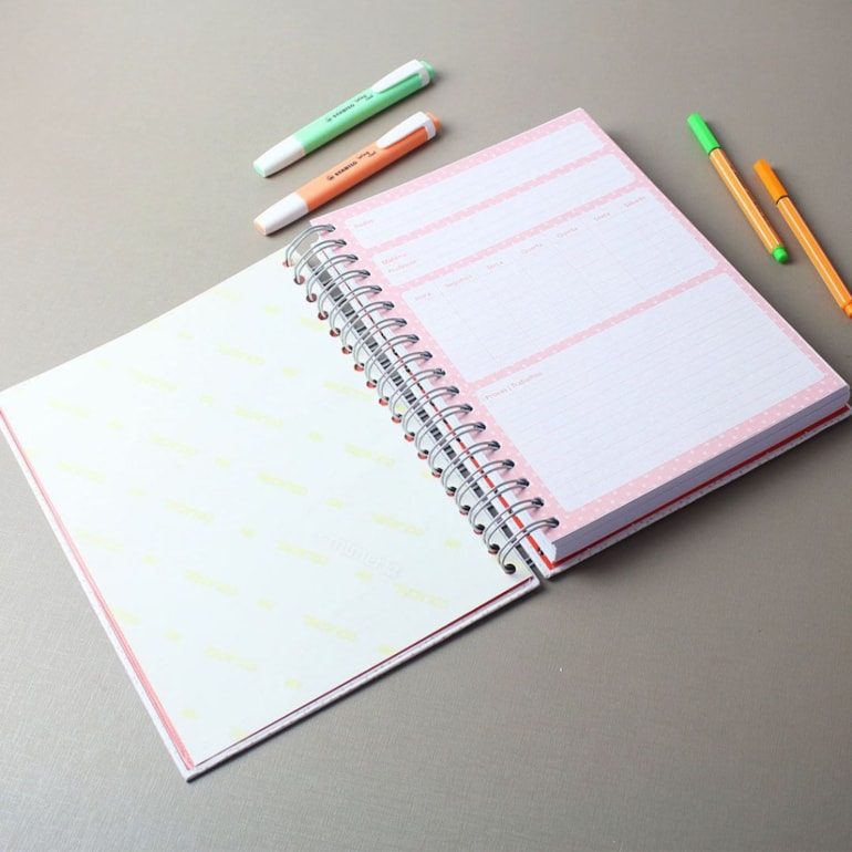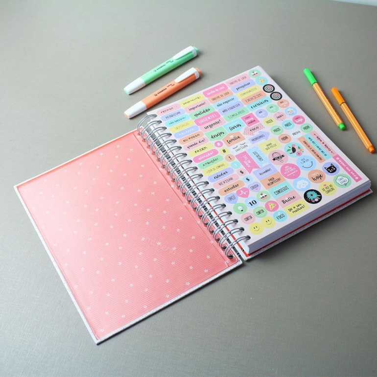 Produzido em materiais de alta qualidade, este caderno vem com 160 folhas pautadas, conta com 10 separadores coloridos, cartela de adesivos, envelope plástico, fechamento em elástico, capa dura e acabamento Wire-o. Tudo o que você poderia querer!
