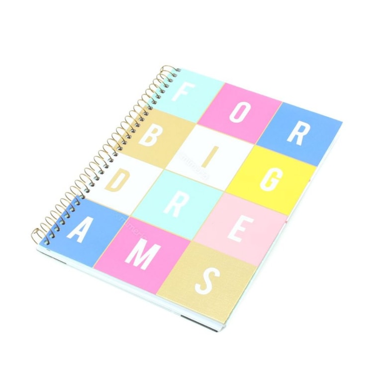 Lindo, este caderno tem capa dura estampada com a frase: “For big dreams” em fundo com quadrados coloridos. Um charme!