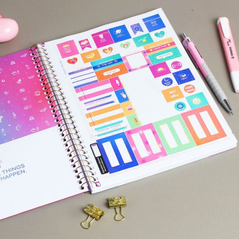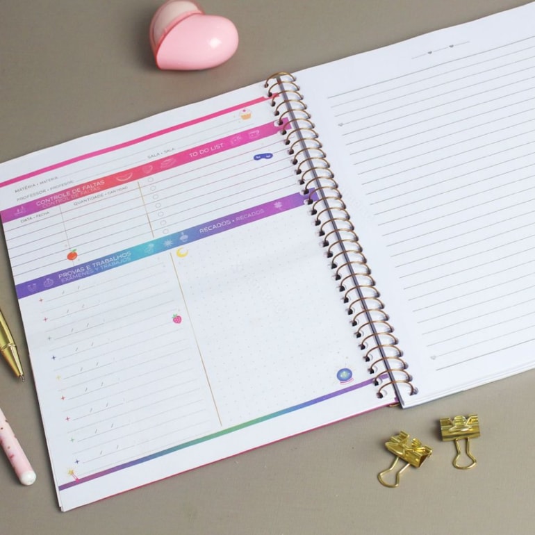 Mega completinho, tem tamanho médio e é ideal para ser usado durante a sua rotina, é compacto e cabe com extrema facilidade na sua bolsa! Ele possui ao todo 80 folhas pautadas, 1 envelope de papel e uma linda cartela de adesivos, é tudo o que te faltava!